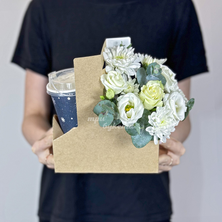 Бокс с кофе и белыми хризантемами