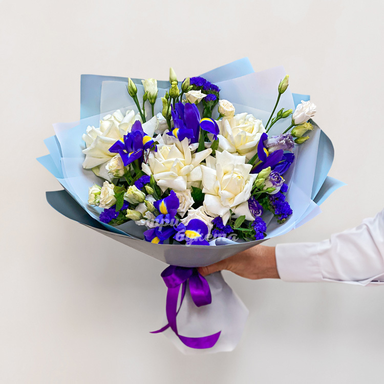 Букет белых французских роз с ирисами