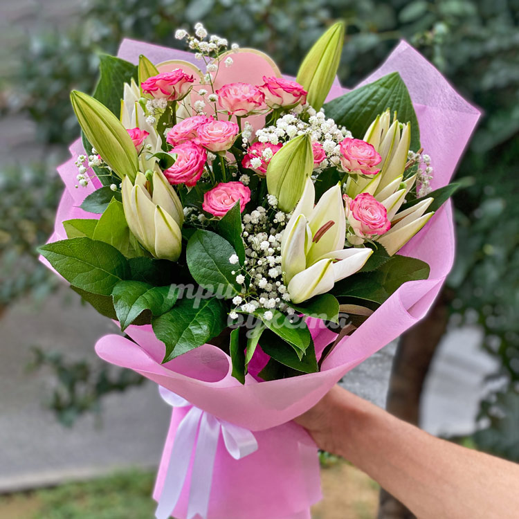 Букет белых лилий с кустовыми розами