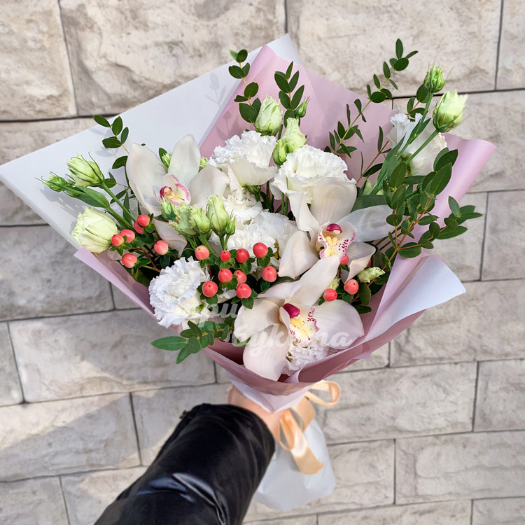 Букет эустом, орхидей и гиперикума