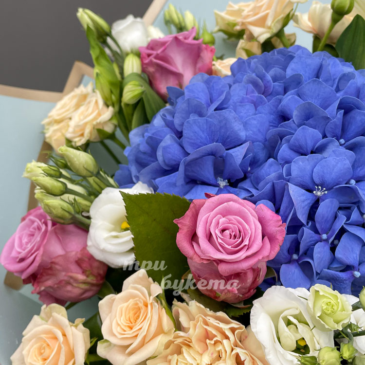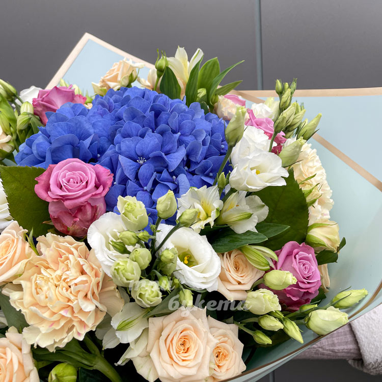 Букет из гвоздик, эустом и гортензии