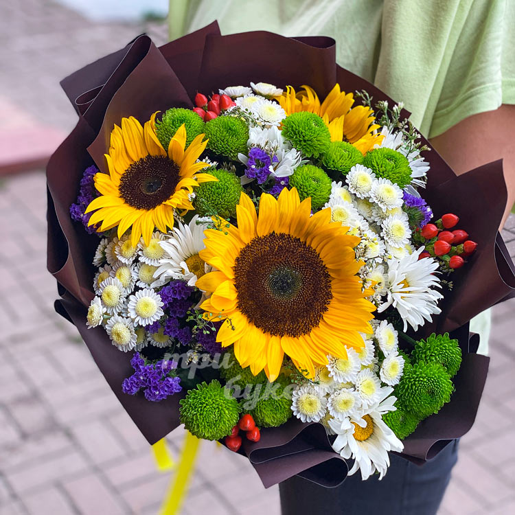 Букет из подсолнухов и хризантем
