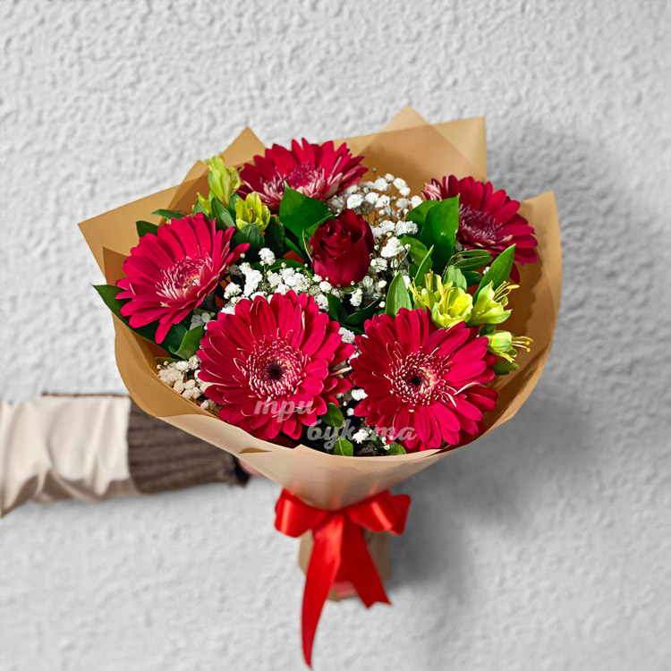 Букет красных гербер с гипсофилой