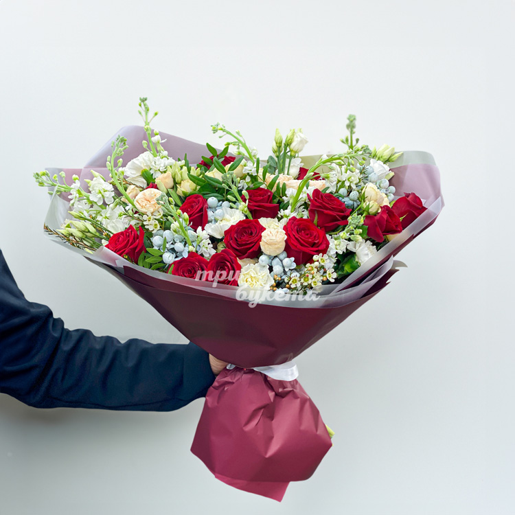 Букет красных роз, белых маттиол и зелени