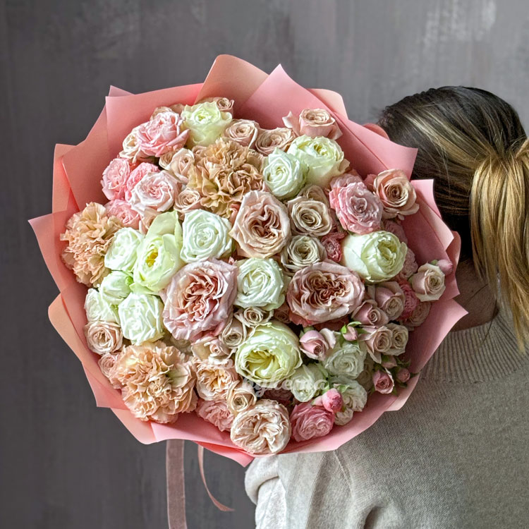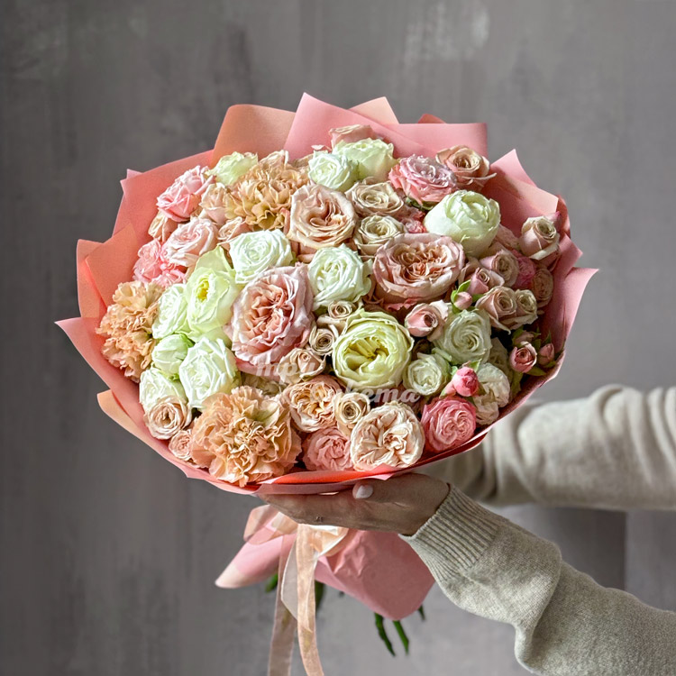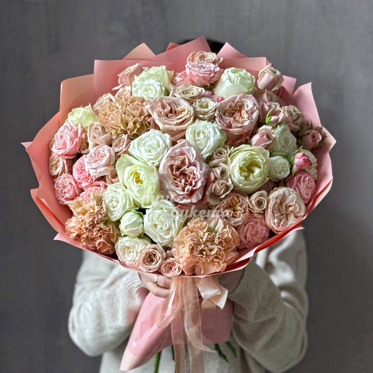 Букет нежных пионовидных роз и диантусов