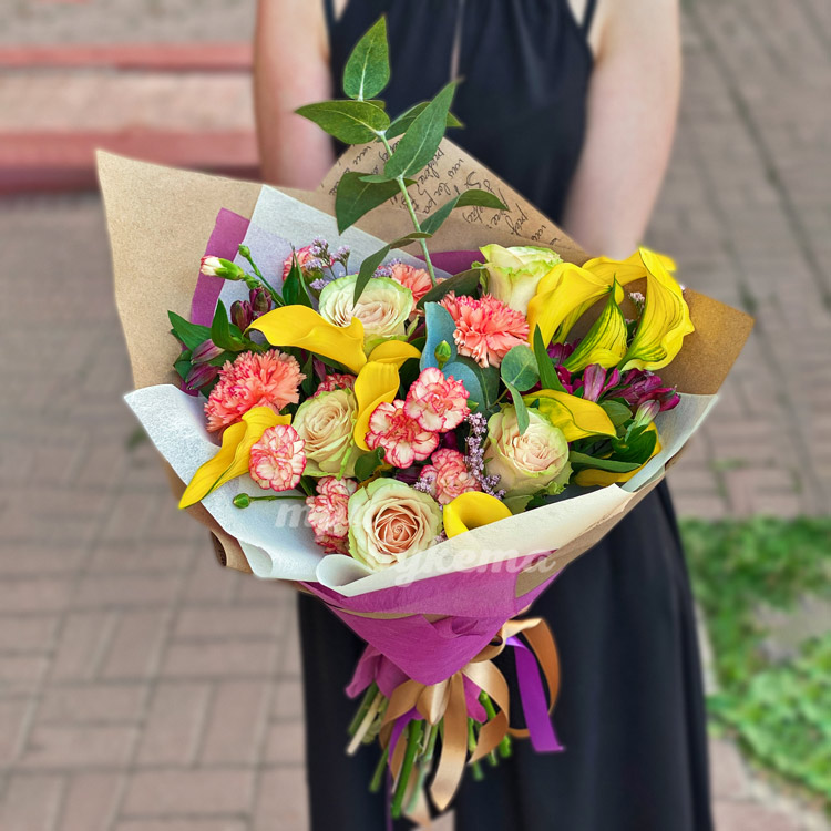Букет персиковых гвоздик и желтых калл