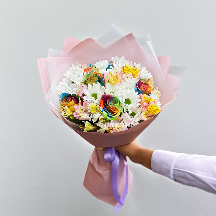 Букет радужных роз с белыми хризантемами