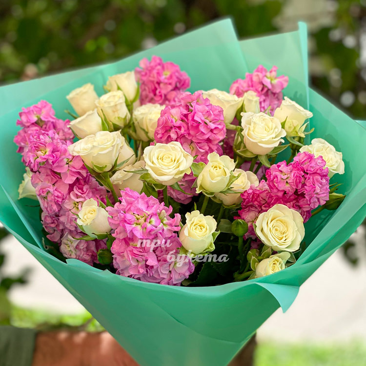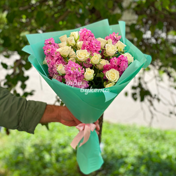 Букет розовых маттиол и кремовых роз
