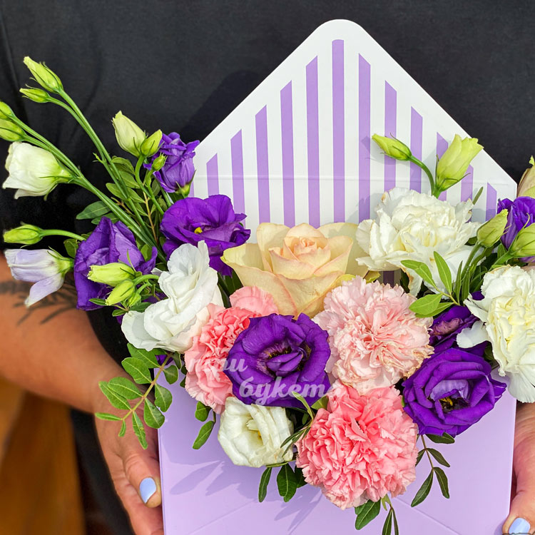 Коробочка с эустомами и гвоздиками