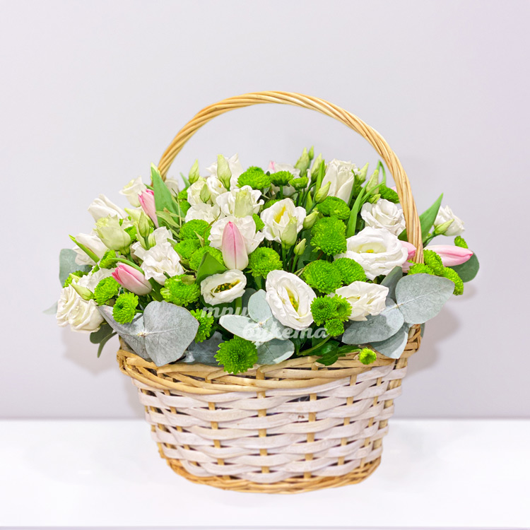 Корзина белых эустом и зеленых хризантем