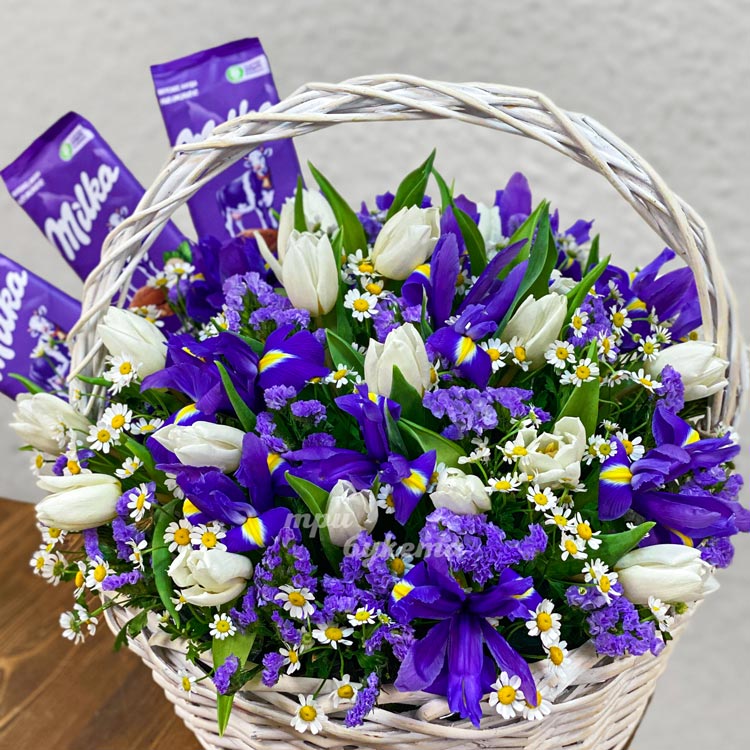 Корзина ирисов и тюльпанов с плитками шоколада