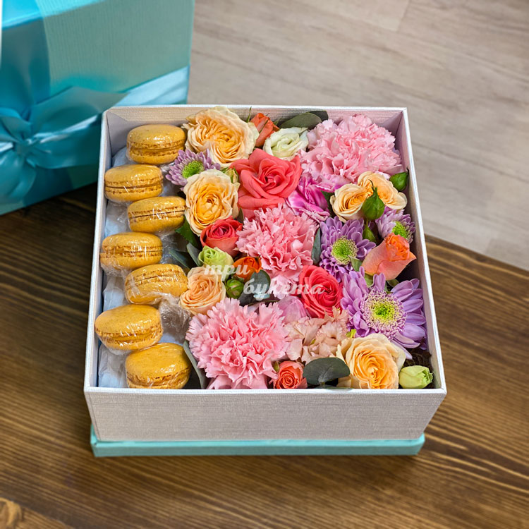 Макаруны с гвоздиками и розами в коробке