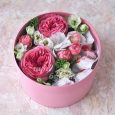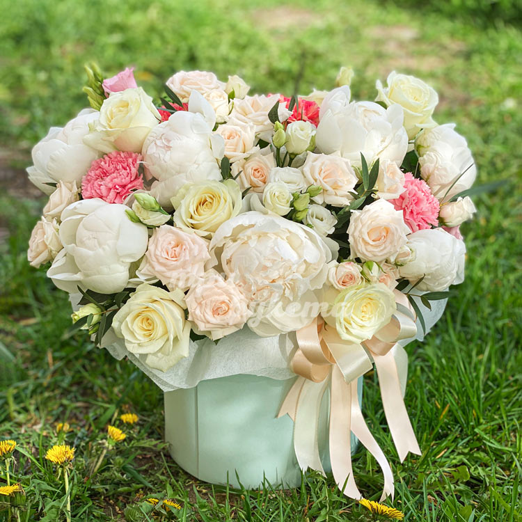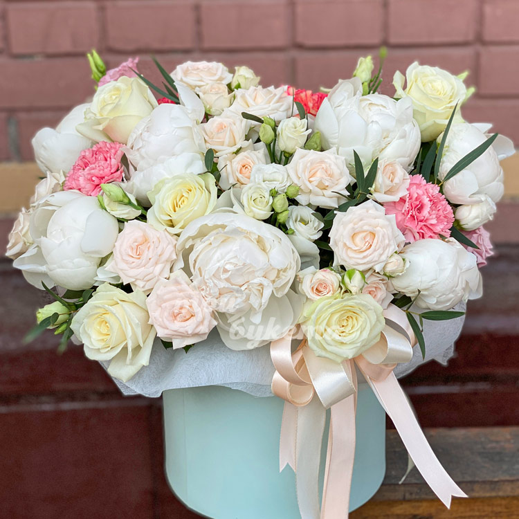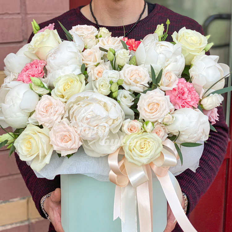 Пионы, розы и эустомы в коробке
