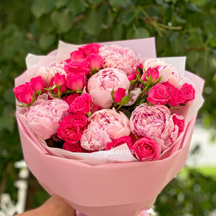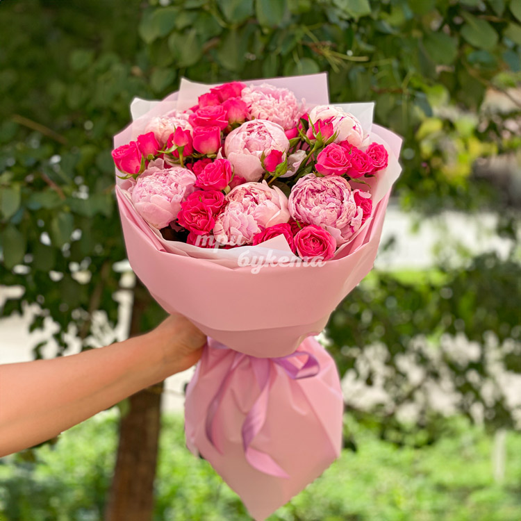 Розовый букет пионов и кустовых роз