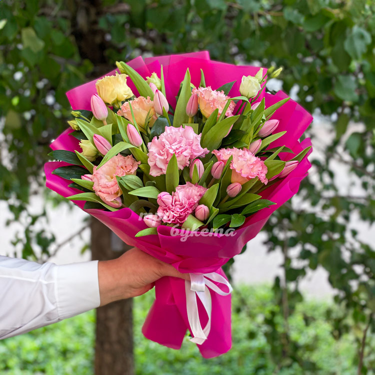 Розовый букет с тюльпанами и эстомами