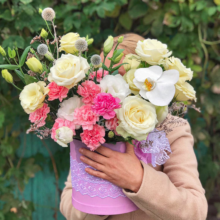 Шляпная коробка с розами и орхидеей